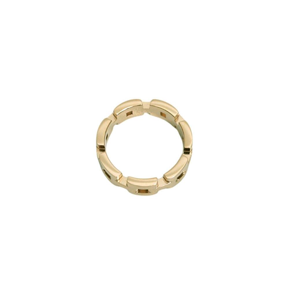 リンクウォッチストラップのデザインを更に小さく、繊細なジュエリーのように昇華させた、ゴールドのリングです。プロポーションはそのままに、リンクにゆとりをもたせることで洗練されたルックを演出します。単体でも、お気に入りのウォッチと合わせても。大胆なデザインが指先に印象的な輝きを与えます。3つのリンク、または5つのリンクからお選びいただける2サイズ展開です。