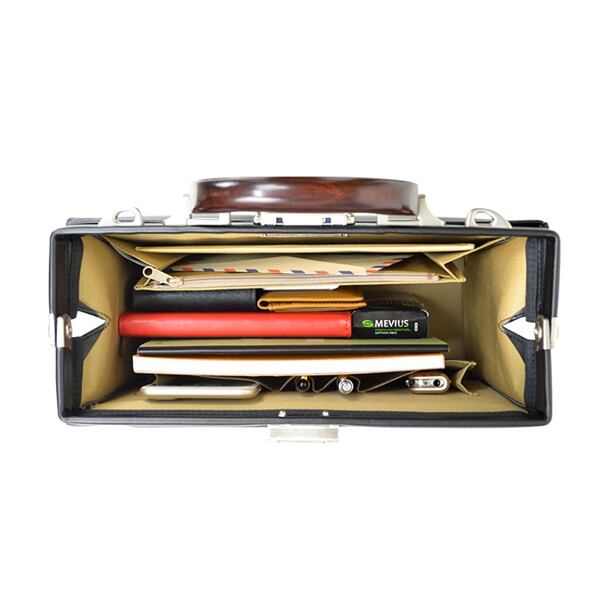 仕様:正面ファスナーポケット、本体内部ファスナーポケット付き、ササマチポケット、片ササマチポケット2ヶ、ペン差し、ワンタッチ錠前専用の鍵付き、肩アテ付きショルダーベルト、底板付き、B5サイズ対応、カラー01-黒