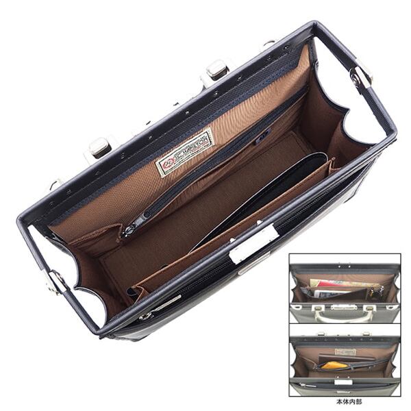 仕様:正面ファスナーポケット、メインルームファスナーポケット付き、片ササマチポケット、ササマチポケット、小物ポケット、ペン差し、ワンタッチ錠前、底板付き、口枠ダレス、肩アテ付きショルダーベルト、B5サイズ対応、カラー:黒