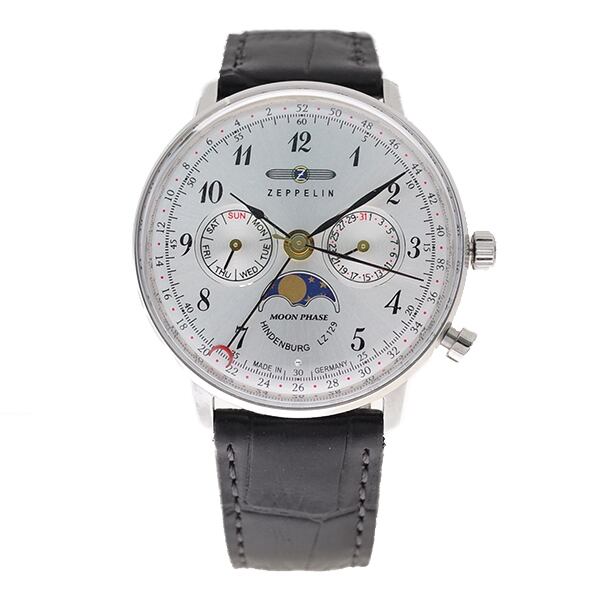 仕様:クオーツ、3気圧防水、カレンダー(日付・曜日)、ムーンフェイズ、カラー:シルバー(文字盤)、ブラック(ベルト)、シルバー(ケース)