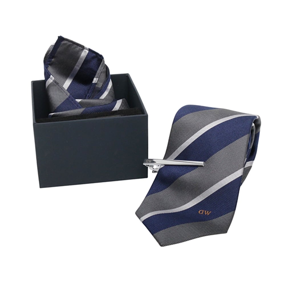 仕様:3点セット(ネクタイ・チーフ・タイバー)、カラー:NAVY×GRAY(ネイビー×グレー)