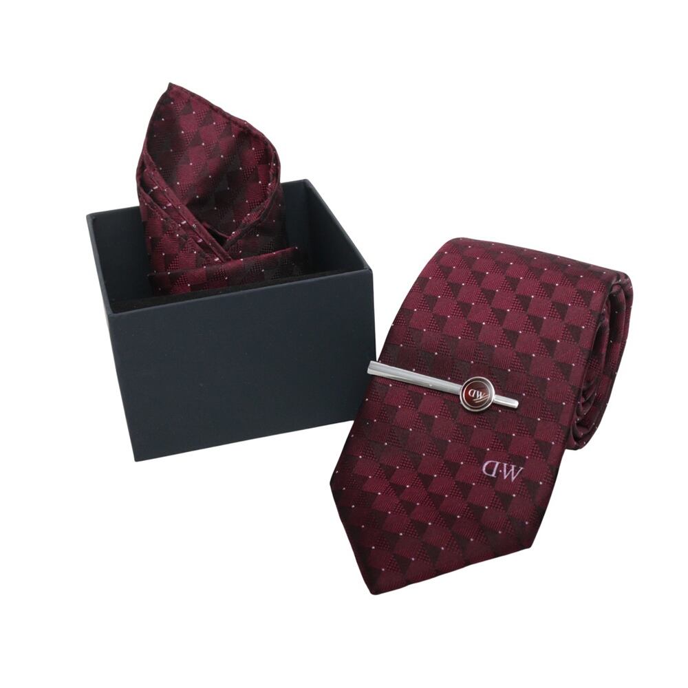 仕様:3点セット(ネクタイ・チーフ・タイバー)、カラー:WINE(ワインレッド)
