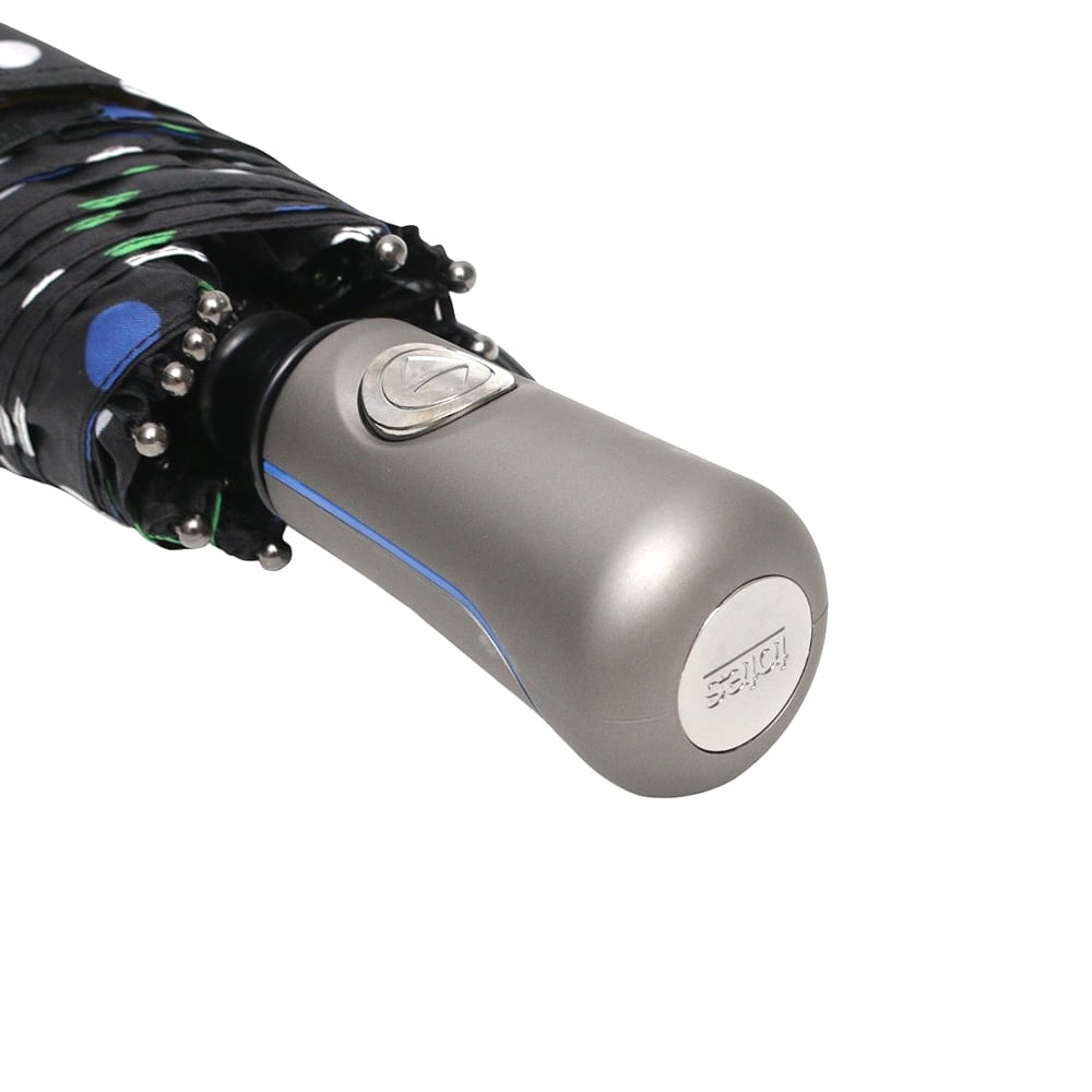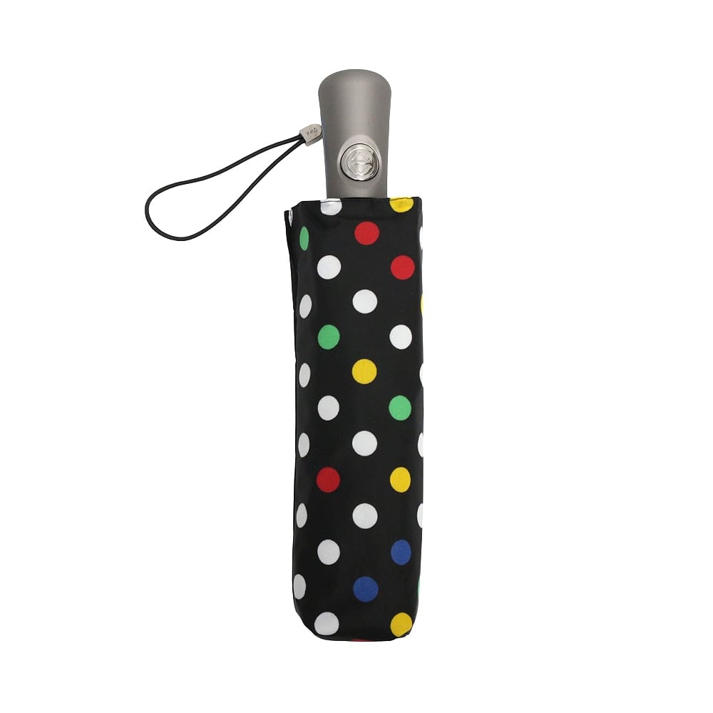 仕様:自動開閉機能、75MPH(時速約120km)までの強風にも耐える防風設計、通気性キャノピー(風を逃がす構造)、SunGuard:UPF50+で有害な紫外線を遮断し、体感温度を最大30℃下げる効果、撥水コーティング加工:水滴が転がり落ちる仕様、人間工学に基づいたハンドル、幅広の面ファスナー付きストラップ、カラー:ブラック×ドット(マルチカラー)