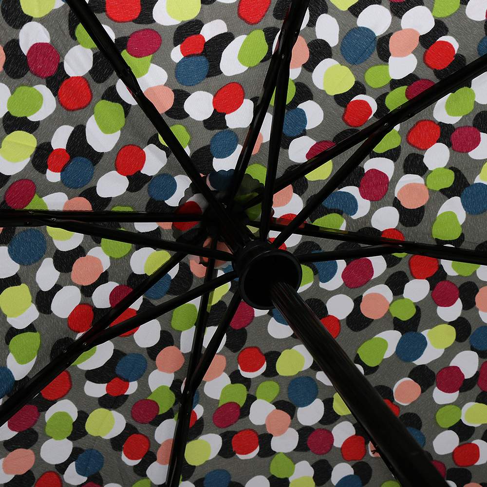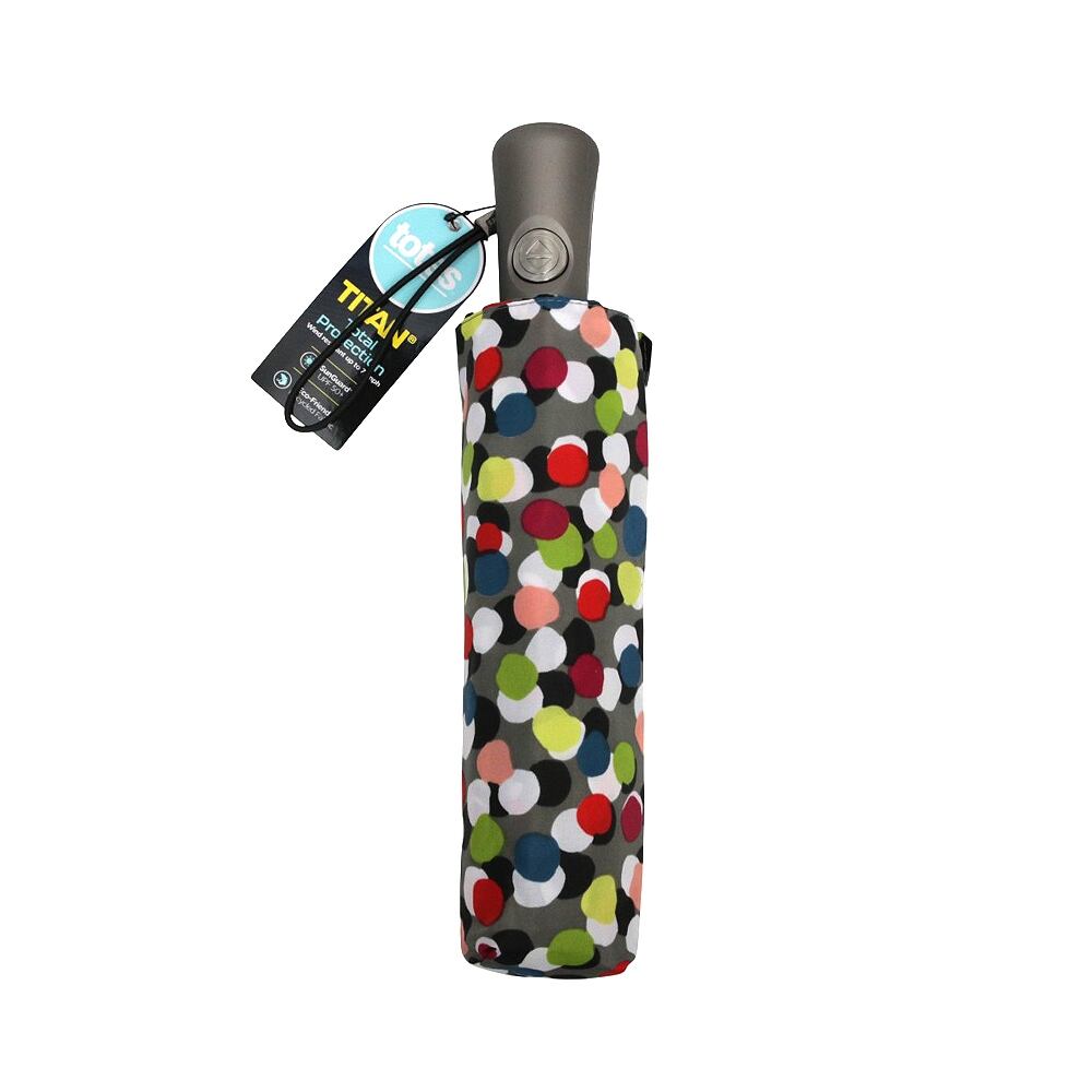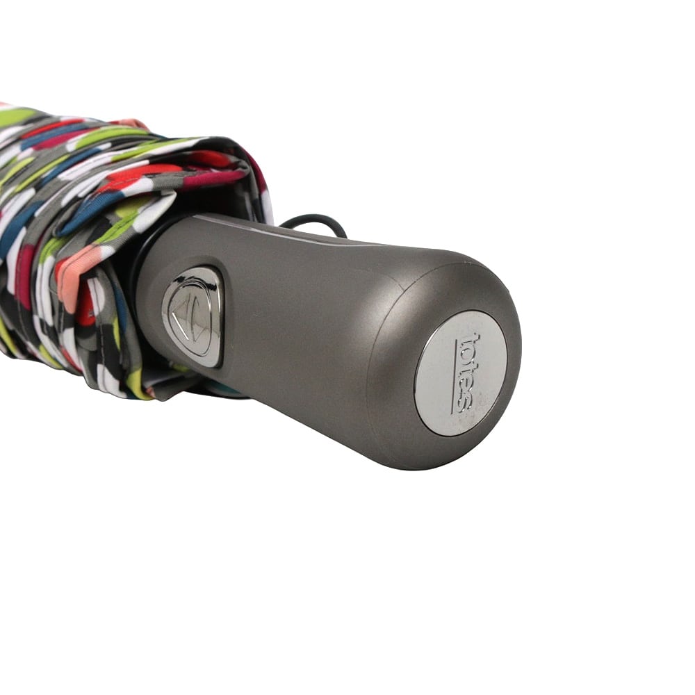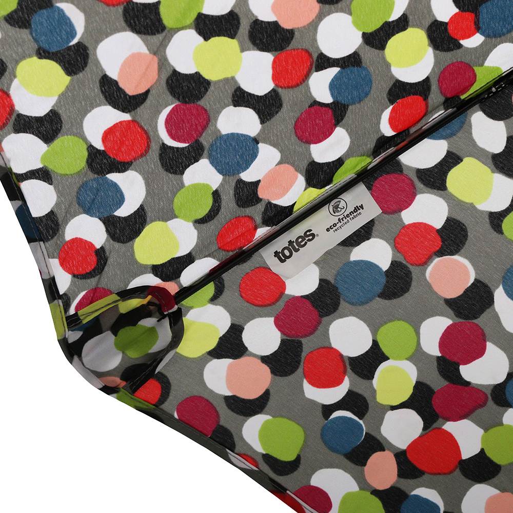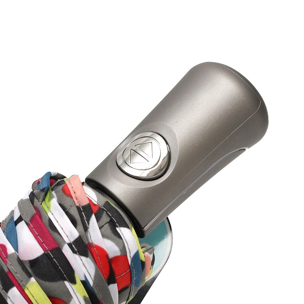 仕様:自動開閉機能、先端が尖っていない設計(Tipless)、Titanフレーム:最大75MPH(約120km/h)の風にも耐える耐風設計、SunGuard:UPF50+で有害な紫外線を遮断し、体感温度を最大30℃下げる効果、撥水コーティング加工:水滴が転がり落ちる仕様、人間工学に基づいたハンドル、幅広の面ファスナー付きストラップ、カラー:ドット(マルチカラー)
