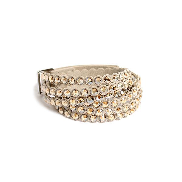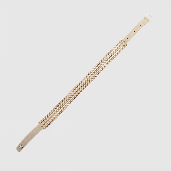 やわらかなアルカンターラ(人工皮革)にきらめくゴールドのクリスタルをあしらい、スワン形のボタンが特徴の調節可能なクロージャーを施したマストハブなデザインです。単独のブレスレットやチョーカーとして身につけたり、お手持ちのPower コレクションのブレスレットと重ねづけして自分だけのアームパーティーを楽しむこともできます。