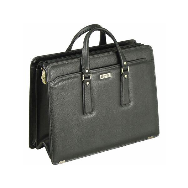 仕様:差し込み錠前、底板付、マチ付両アオリ、正面:アテポケット、本体内部:ファスナーポケット、携帯ポケット、ペン差し、カード入れ、つめ足、B4サイズが収納可能(36.4×25.7)、携帯電話収納ポケット付、生産国:日本、カラー:ブラック